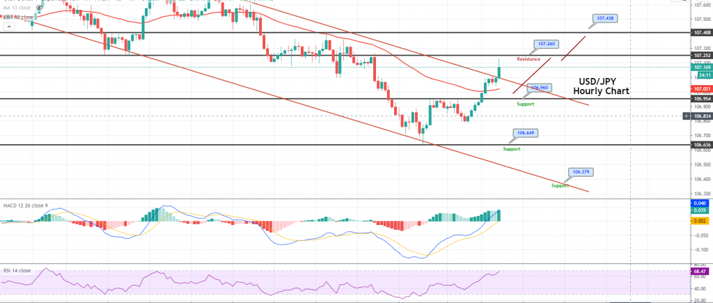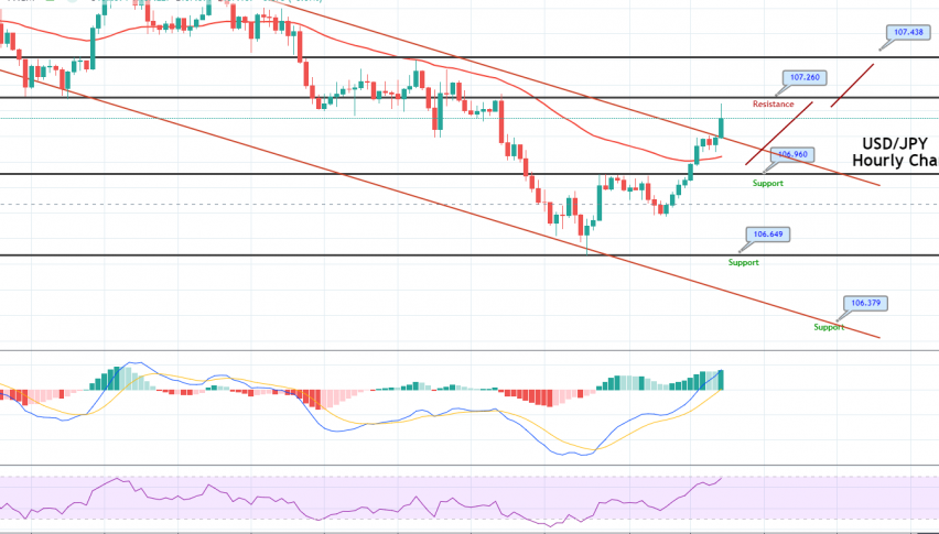 During Monday’s European trading session, the USD/JPY currency pair successfully stopped its early-day losses, taking some modest bids above the 107.00 mark. However, the currency pair is trading with a mild bullish bias, mainly due to the risk-on market sentiment, triggered by incoming positive economic data, and this raised hopes of a swift economic recovery, remaining supportive of the upbeat market mood. However, the risk-on market sentiment undermined the safe-haven Japanese yen and provided a modest lift to the USD/JPY pair.