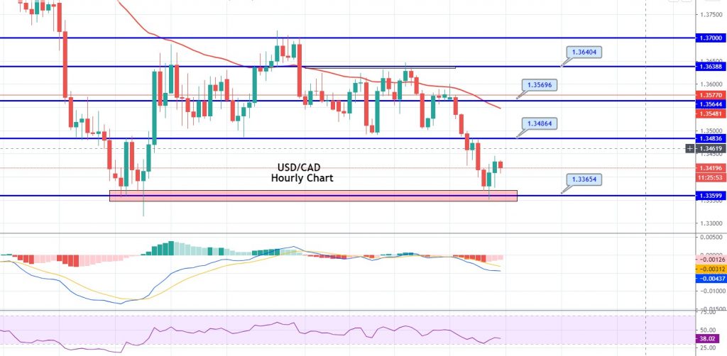 Technically, the USD/CAD has bounced off the support level of 1.3365. Closing of candles above this level could extend buying until the 1.3486 level, which will now work as a resistance. Overall, the trading bias is bearish, as the pair is holding below 50 periods EMA, and the MACD also suggests a selling bias. Let’s consider selling below the 1.3486 level today. Good luck!