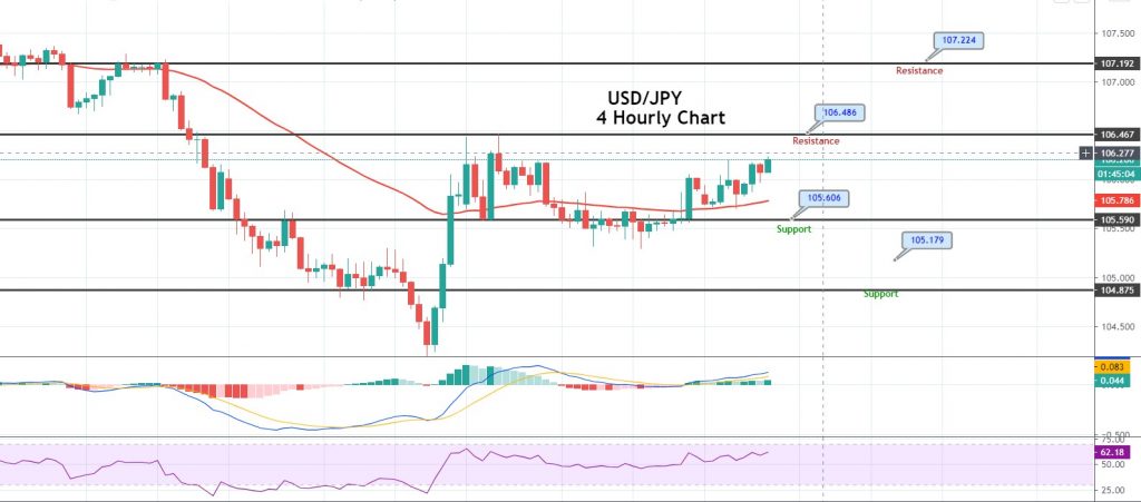 The USD/JPY pair is trading at the 106.082 level, holding below an immediate resistance level of 106.486 and a support area of 105.620...