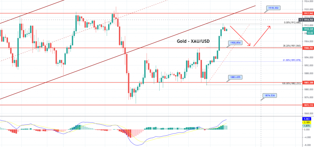 Pivot Point: 1,896.65The precious metal, gold, has soared sharply to trade at the 1,912 level, but the closing of a neutral candle below this level suggests a mixed bias among traders. Therefore, another closing of a bearish engulfing candle or tweezers top pattern may initiate a bearish correction/retracement in gold. On the lower side, gold may find support at 1,906 and 1,899. Conversely, a bullish breakout at resistance levels of 1,912 may extend the buying trend until the 1,919 level. Good luck!