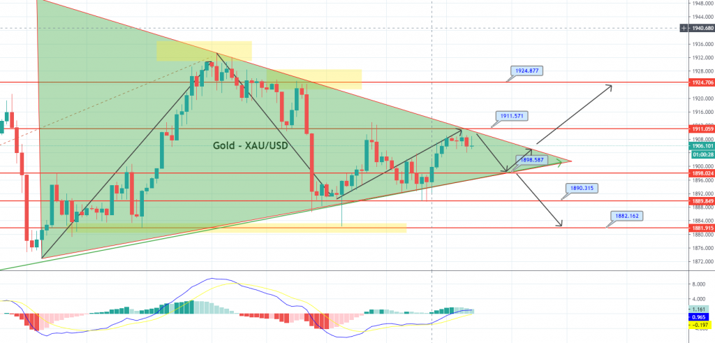 The gold prices closed at 1,908.21, after placing a high of 1,908.87, and a low of 1889.47. Overall, the movement of gold remained bullish t