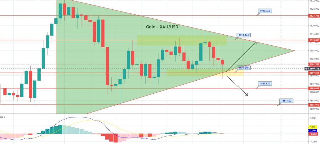 Prices for the yellow metal, gold, closed at 1,904.17, after placing a high of 1,918.45, and a low of 1,896.96. Overall, the movement of gold remained bullish throughout the day. The precious metal prices surged to the highest level in four days in early trading sessions on Monday, but they failed to stay there, and were pushed back by the renewed pressure that emerged, due to the lack of stimulus measures in the US.