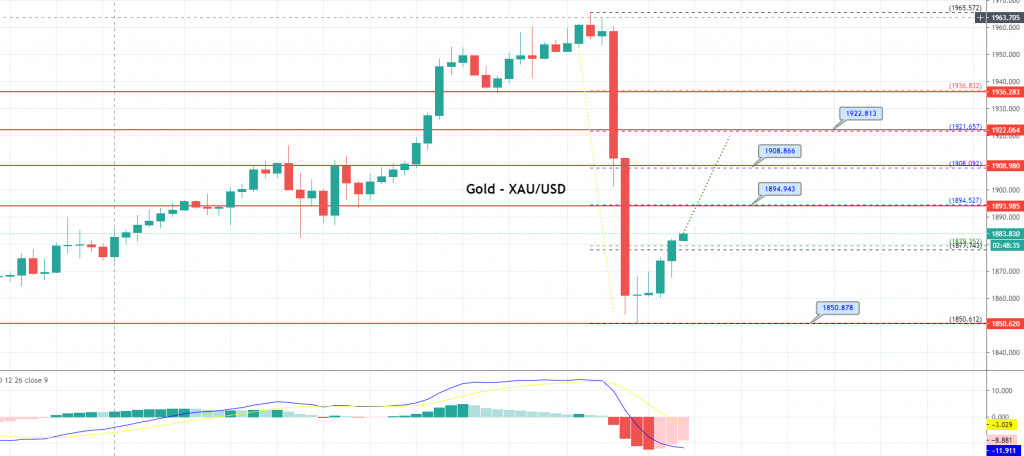 According to the technical analysis, the precious metal, gold, has entered the oversold zone, after falling nearly 5% within a single day. At the moment, gold is trading above the 1,850 level, which is extending its immediate support now. On the higher side, gold may find the next resistance at around 1,894, which marks the 38.2% Fibonacci retracement level. Continuation of a bullish trend may drive further bullish movement in gold, until the 50% Fibonacci retracement level at the 1,908 mark. Good luck!