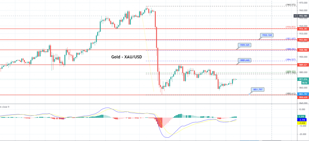 Pivot Point: 1,866.57Trading in the precious metal, gold, continued to be bearish, on the back of a stronger dollar and faded safe-haven appeal. On the lower side, the precious metal GOLD may find support at the 1,851 level and resistance at the 1,880 level. Continuation of a further upward trend could lead the precious metal GOLD to the 1,909 area. The MACD is neutral; however, the odds of sideways treading remain strong between 1,889 and 1,851. Good luck!