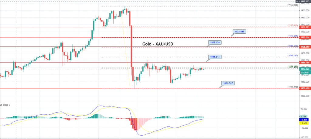 Prices for the precious metal, GOLD, closed at 1,876.72, after placing a high of 1,883.77, and a low of 1,862.71. The direction of the GOLD prices reversed on Thursday, recovering almost all of the losses of the previous day. The sudden rise in GOLD prices was caused by the increasing number of coronavirus cases in the US, which raised the safe-haven demand. Another reason behind the recent surge in GOLD prices was the expectations that the Federal Reserve will inject fresh funds into the markets to ensure that they don’t freeze up again, like they did in March.