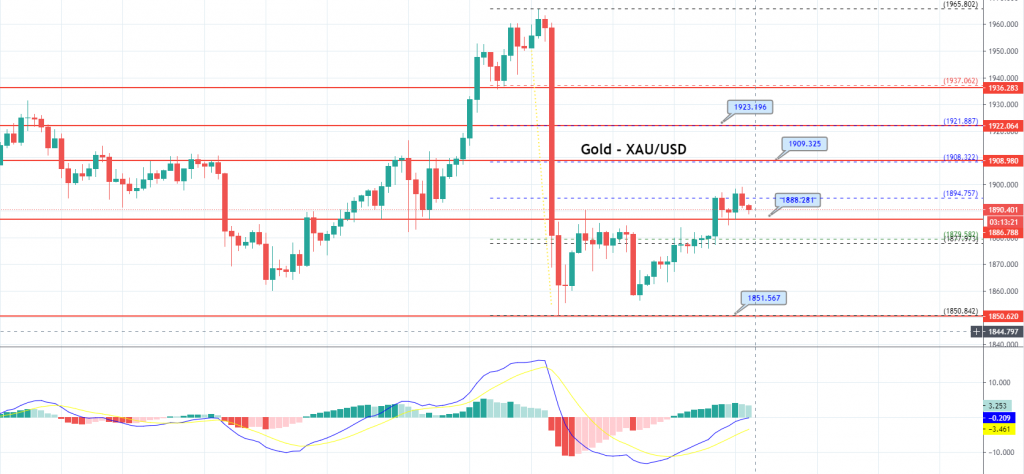 Meanwhile, the market risk sentiment got a lift after upbeat data from China, which pushed the S&P 500 futures higher. As a result, the upbeat market tone became the key factor that kept a lid on any additional gains in the safe-haven metal. Across the pond, the market trading sentiment was rather unaffected by the Sino-American tussle, which recently picked up pace after the Trump administration showed its willingness to limit investments in Chinese companies. The yellow metal is currently trading at 1,890.30 and consolidating in the range between 1,886.99 and 1,899.01.
