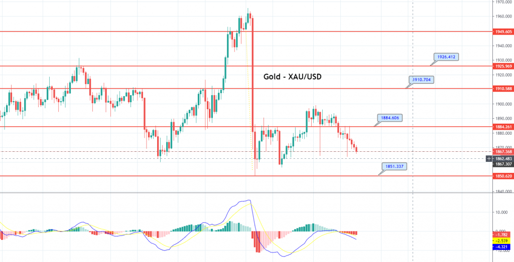 Pivot Point: 1,872.80The precious metal, GOLD, has had a bearish breakout at the 1,876 support level. Closing of candles below the 1,876 level is likely to drive the selling bias until the next support area of 1,865. A bearish breakout of 1,865 is likely to drive the selling trend until the 1,858 level. On the higher side, the resistance remains at the 1,876 mark. The bullish bias remains strong over 1,865, and below this, a selling bias could dominate the market. Good luck!