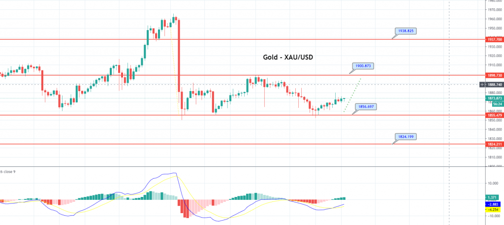 Pivot Point: 1,861.37Prices for the precious metal, GOLD, remain supported over the 1,856 level, facing immediate resistance at the 1,880 level. So far, on the technical side, the precious metal is mostly unchanged, as traders seem to be waiting for a solid reason to enter the market. The MACD and RSI are holding in a bullish zone, supporting the bullish bias; therefore, it’s worth looking for a buy trade over the 1,861 level. Let’s consider taking a buying trade over the 1,861 level today, to target the 1,888 level. Good luck!