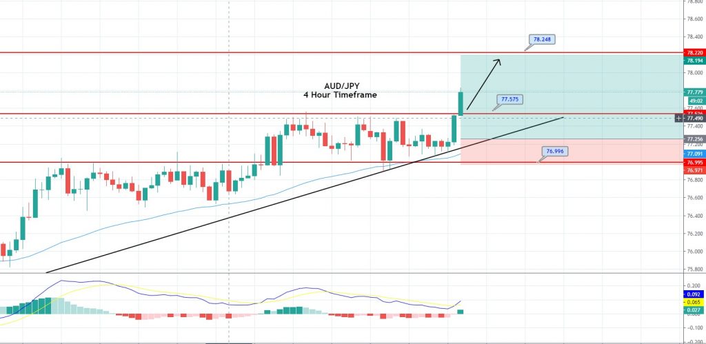 The AUD/JPY pair has violated the ascending triangle pattern at the 77.50 level, opening further room for buying until the next resistance area of 78.24. On the 4-hour timeframe, the AUD/JPY pair has violated the ascending triangle pattern at 77.50, which is opening additional room for buying in the pair. At the moment, 77.50 will be working as a support, and below this, the selling trend in the AUD/JPY pair could be extended until the 77.25 level. The MACD is also suggesting a bullish sentiment; therefore, we have entered the long-term buy signal in the AUD/JPY pair, to capture 80 pips. Stay tuned for further updates!