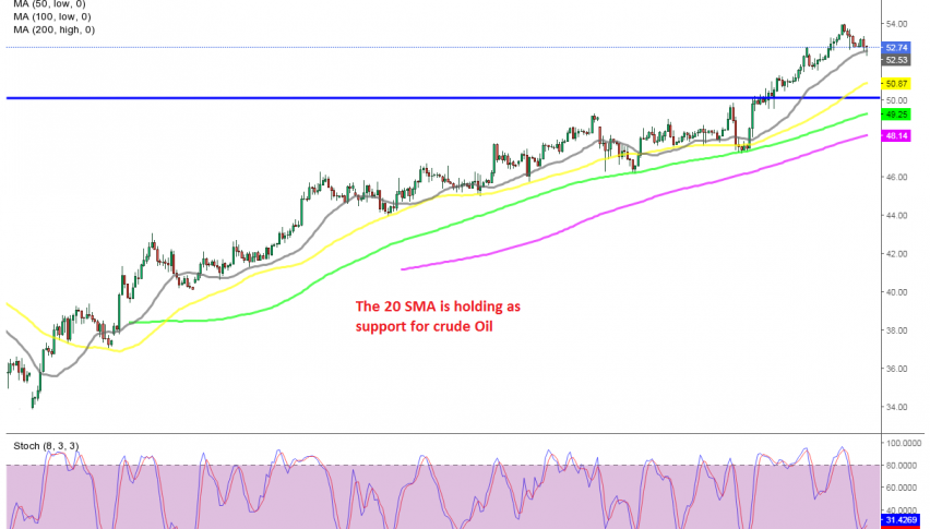 In the last two weeks, the bullish trend has accelerated after the last bounce off the 100 SMA and the higher moving averages haven’t been able to catch up. As a result, the 20 SMA is acting as support for US WTI crude Oil now, which caught up after Oil retraced more than 150 pips lower.