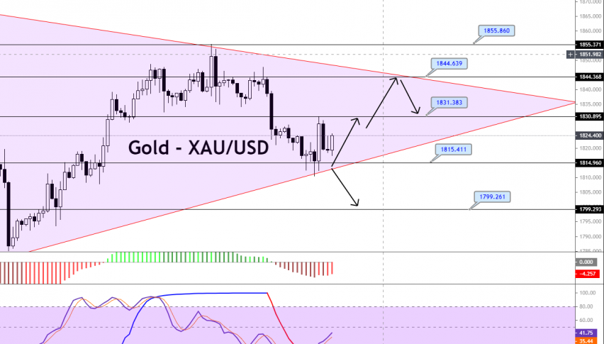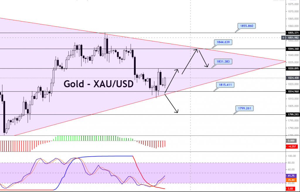 Pivot Point: 1,832.37GOLD is trading sideways, within a narrow trading range of 1,831 and 1,815, amid a lack of volatility in the market. The precious metal has also formed a symmetrical triangle pattern on the two-hourly timeframes, extending resistance at the 1,844 level, with a support area of 1,815. On Monday, the bullish breakout at 1,831 could extend the buying trend until the 1,844 resistance level, whereas the violation of the support level of 1,815 could drive sharp selling until the 1,799 mark. The MACD and other oscillators support a selling bias, but we can only take a sell trade upon a breakout at 1,815. Good luck!