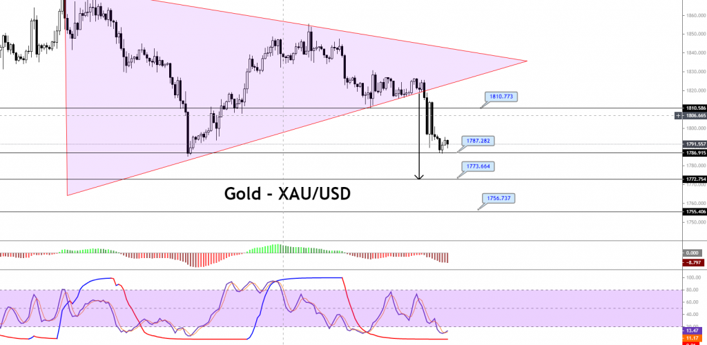 The prices for the precious metal, GOLD, fell sharply from the 1,814 area, to around 1,786, amid a stronger dollar. On the two-hourly timeframes, GOLD has violated the symmetric triangle pattern, suggesting odds of a strong selling bias until the 1,772 area for now. The immediate support remains around 1,799, which might trigger a slight buying/correction until the 1,800 area, but odds of selling until 1,772 remain solid. Good luck!