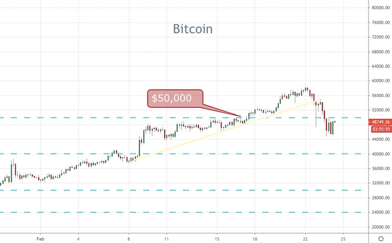 Bitcoin wasn’t spared and it shed around 10% of its value and is now back under the key $50,000 level. Not only did it fall back under, but it did so on huge volume. Technically, when we see a break of a big level on volume, that suggests there might be more to come.