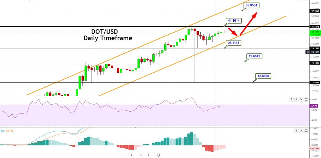 In terms of the technical outlook, the DOT/USD pair is trading with a neutral bias at the $ 37.22 level. On the daily timeframe, the DOT/USD has formed an upward channel, which is keeping the DOT/USD pair bullish over the $ 28.50 support level.