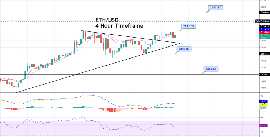 Pivot Point: 2077.63ETH/USD is trading sideways at 2,115, gaining support at the 2,002 level. Violation of this level can lead the pair towards the 1,883 level, whereas the violation of the 2,135 level can lead the price towards the 2,247 level. The MACD and RSI levels suggest a bullish trend, along with the 20 & 50 EMA that supports a bullish bias. On Monday, the pair violated the asymmetric triangle breakout, which is now supporting a bullish bias in ETH/USD. The bullish breakout of 2,136 levels now can drive buying until 2,247. Good luck!