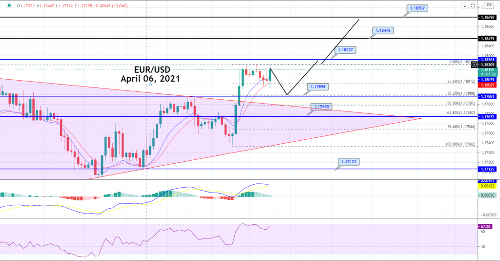 The EUR/USD pair closed at 1.18125 after placing a high of 1.18196 and a low of 1.17382. The US dollar slipped on Monday against its rival currencies, driven by the decline in US bond yields. The US Treasury prices edged higher on Monday and pushed the yields lower as investors paused recent selling of government bonds and took profits from short positions though the uptrend in rates remained intact after the positive NFP report on Friday.