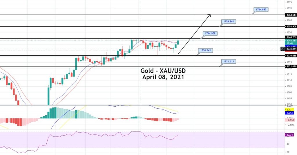 Today in the Asian trading session, gold managed to stop its overnight declining streak and drew some modest bids around above $1,745 level as the U.S. Federal Reserve kept to a dovish stance in the minutes from its latest policy meeting, which tends to weaken the U.S. dollar and contributes to the yellow-metal gains. The U.S. Federal Reserve failed to give any new catalysts to control the market direction and remained doubtful about the U.S. economic recovery from COVID-19. This was understood as a leading factor that lends some support to the non-yielding yellow metal. On the flip side, the prevalent upbeat market sentiment, backed by the strong pace of coronavirus vaccinations and U.S. President Joe Biden’s infrastructure spending plan, turned out to be one of the critical factors that cap additional gains in GOLD. The yellow metal prices are currently trading at 1,744.30 and consolidating in the range between 1,733.26 and 1,745.45.