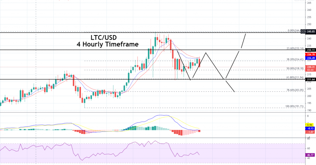 Pivot Point: 224.920The LTC/USD pair trades with a bearish bias at 226.25 level as the pair has entered the overbought zone. For now, Litecoin is likely to drop until the 218 level that marks 50% Fibonacci retracement. On the lower side, violation of 218 level can extend selling trend until 211 level. The RSI and MACD are still holding in a buying trend, while the 20 and 50 periods EMA support a selling bias. Let’s consider taking a sell trade below 231 level today. Good luck!
