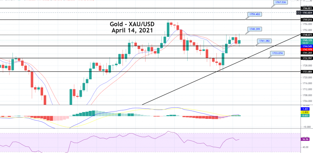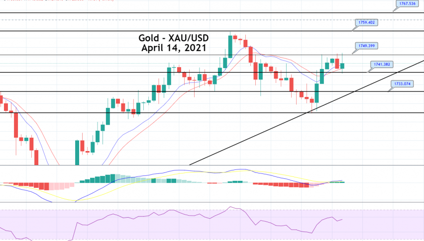 Moreover, the prices took some further support from the concerns over the recent halt in the use of the Johnson & Johnson (NYSE: JNJ) COVID-19 vaccine. Besides this, the tension between the U.S. and China intensifies further after China warned the U.S. to control its relations with Taiwan, which helps the safe haven metal limit its deeper losses. On the opposite side, the upbeat market mood, backed by a combination of factors, was seen as one of the critical factors that cap additional gains in the safe haven metal. The yellow metal prices are currently trading at 1,746.07 and consolidating in the range between 1,740.88 and 1,749.37.