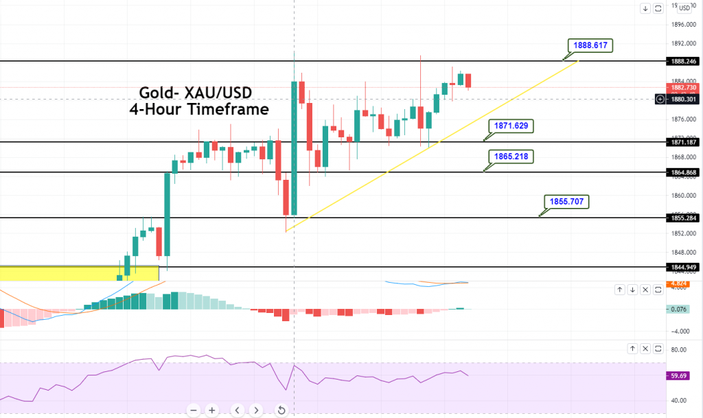 On the technical front, GOLD is trading strongly bullish at 1,883 level. On the higher side, gold is likely to face resistance at 1,888 level and support at 1,871. The 4-hour timeframe has formed an ascending triangle pattern that’s likely to extend resistance at 1,888 level along with a support level of 1,871. The indicators like RSI and MACD support a bullish trend. Therefore, we should consider taking a buying trade over 1,880 level and selling trade below the same. A bullish breakout of 1,888 level can lead the price towards 1,899. Good luck!
