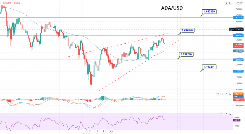 On the technical front, the ADA/USD pair is trading at the 1.4146 level, facing immediate resistance at 1.4923. Closing of candles below 1.4923 suggests weakness in the investors’ bullish tone. On the lower side, the upward trendline supports the ADA/USD pair at the 1.3935 level. The 50 periods EMA is still supporting a buying trend at the 1.4001 level. In case of a bullish crossover at 1.4923, the ADA/USD could go after the next resistance area of 1.5500 and 1.6332. The leading indicators, like the MACD and the