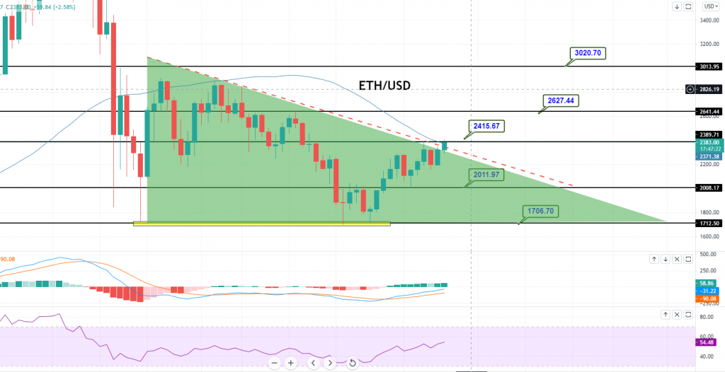 triangle pattern at 2,350. A bullish breakout at this level increases the odds of a continued bullish trend in the ETH/USD coin. Lastly, the 50 EMA is also likely to show us a bullish breakout, and if this happens, we may open a buy trade in the