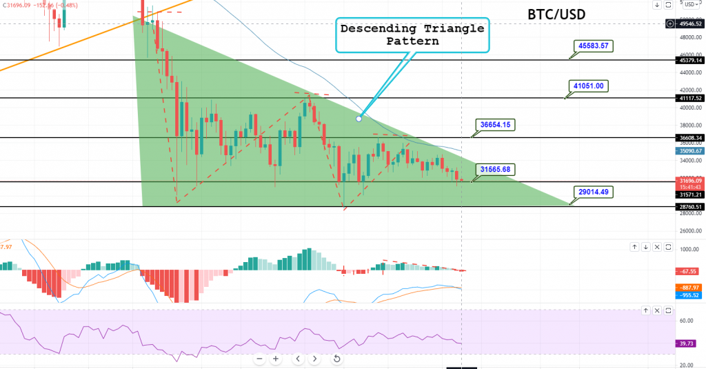 BTC has dropped by 2.30% in the past twenty-four hours. There is a risk of more losses in this crypto if it fails to recover above the $32,200 and $33,000 resistance levels. Initial support to the downside is around the $31,500 mark. The first major support is now around the $31,200 level. A close below $31,200 could trigger a sharp decline in the near term. Thus, the price is expected to test the $30,000 support level.