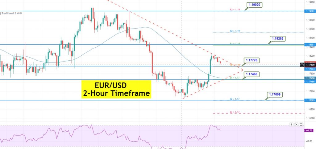 On Monday, the EUR/USD pair is trading with a bearish bias at the 1.1780 level. After hitting a high of $1.1805 and a low of $1.1791, the EUR/USD ended the day at $1.1791 on Friday. In response to continued weakness of the US dollar, the EUR/USD pair reversed, turning green for the day.