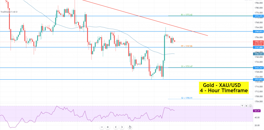 Gold was trading with a bearish bias at the 1,752 level on Friday, with immediate resistance at the 1,760 level. This resistance level is being extended by a downward trendline that we can see on the 2-hourly timeframe.