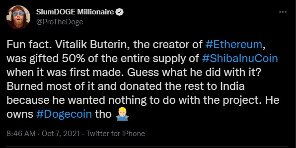 Glauber Contessoto, a self-proclaimed Dogecoin millionaire, reportedly recalled that Ethereum co-founder Vitalik Buterin was originally given half of the Shiba Inu coins when it was first introduced. He donated a portion them and he subsequently burnt the rest. Meanwhile, Buterin has joined the advisory board of the re-established Dogecoin Foundation.