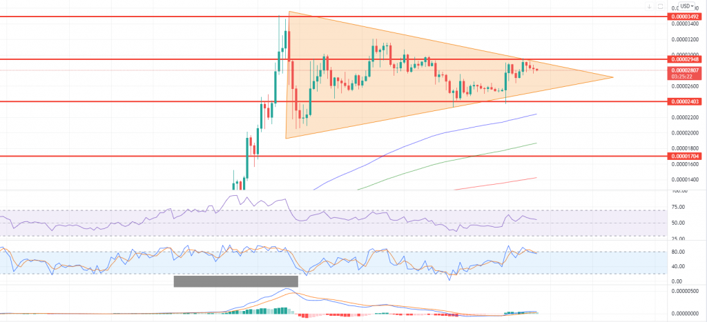 Shiba Inu Price Analysis: SHIB/USD Tossing in Triangle at $0.000027
