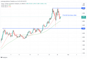 Looking at the 4-hour chart, we can see that FTM/USD hit the ATH of 3.45 on October 26, before prices plunged to 2.5. The area at 3.45 is already turning into a major resistance, as FTM/USD was resisted again on October 28 and is now retreating down. Such price action behavior suggests that the resistance continues to hold, and FTM/USD could be set for a major correction.
