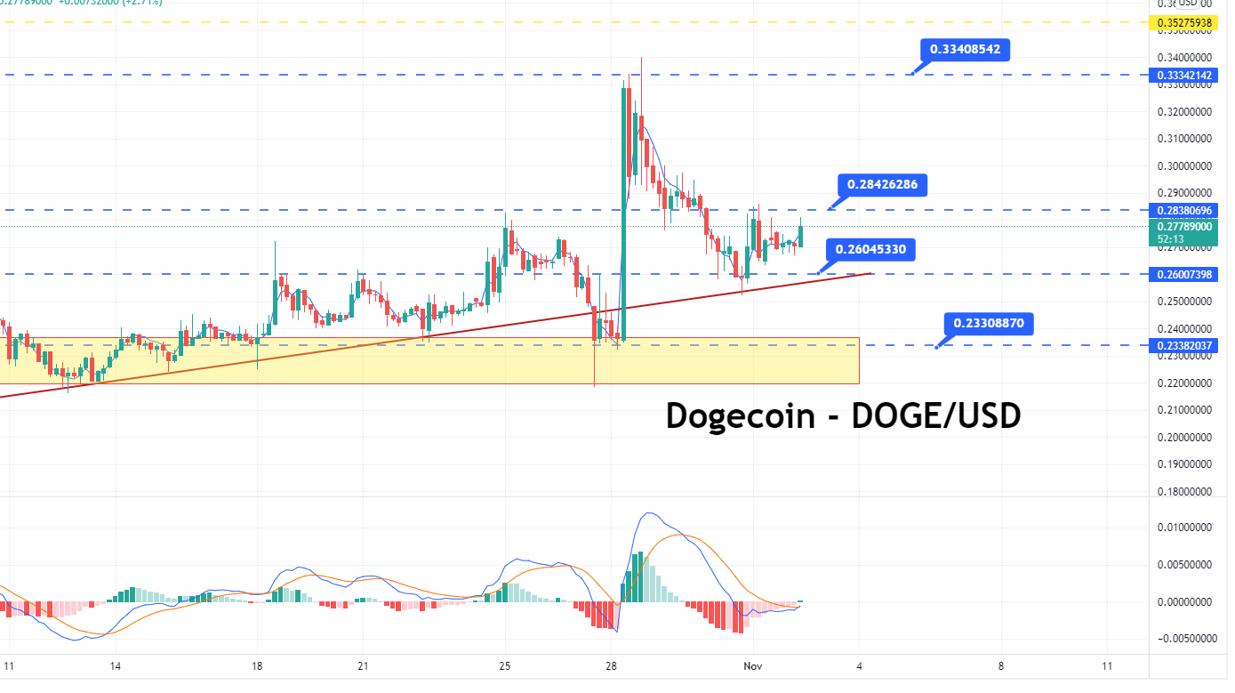 The DOGE/USD closed at $0.271800, after reaching a high of $0.285800, and a low of $0.263600. Dogecoin fell again on Monday and reversed its course, despite positive developments surrounding the ecosystem, and the weakness of the US dollar.