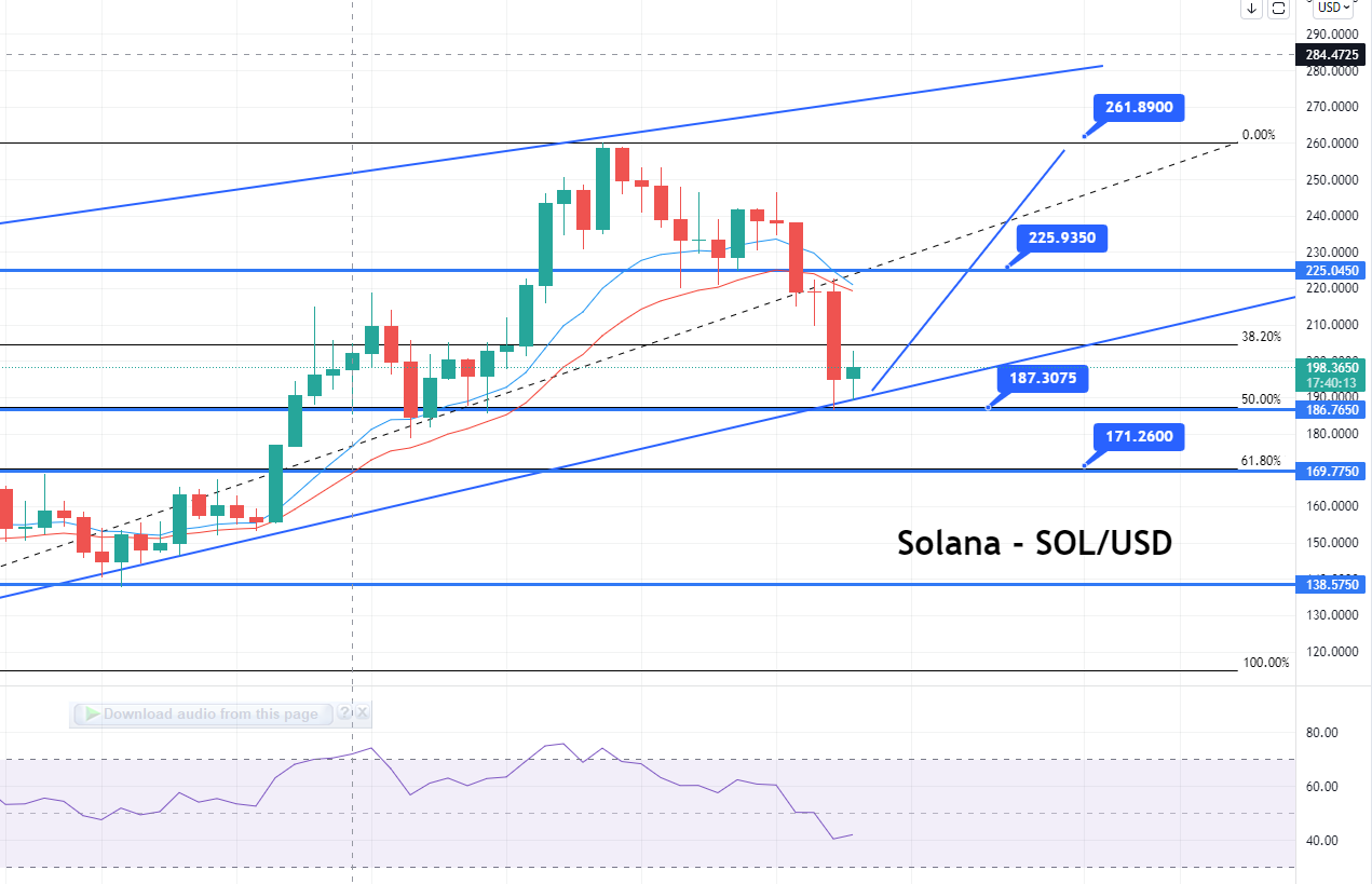 The SOL/USD closed at $195.164 after hitting a high of $222.755 and a low of $187.176. Solana dropped for the fifth consecutive session