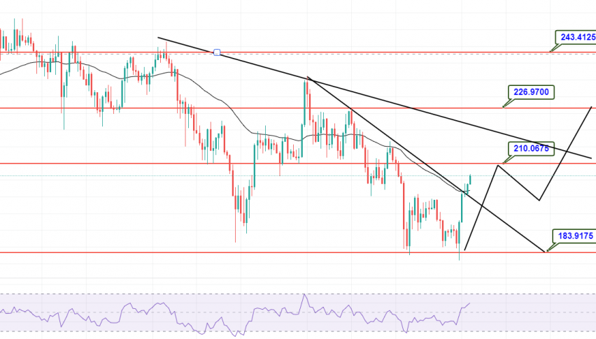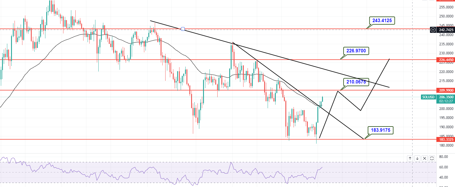However, Solana has crossover the 50 EMA, signaling that bullish bias persist, and the buyers are seeking to push the price higher to resistance line. If they keep the price above 50 EMA, the SOL/USD pair might spike to $210, and then to $216.
