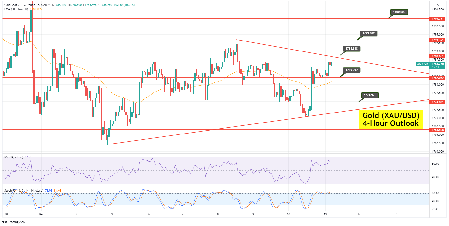 The US Consumer Price Index accelerated by about 6.8% this year, through November – this was the most significant year-to-year advance since June 1982. The high inflationary pressures depicted by the CPI report somehow fell short of market expectations and boosted gold, which pushed its prices up on Friday. Meanwhile, the US Dollar Index, which measures the value of the greenback against a basket of six major currencies, fell to 95.98 on Friday, adding further to the gains in the yellow metal. The US Treasury yield on the benchmark 10-year note also dropped, coming in at 1.45%, and dragging the greenback further down, which had a positive impact on the gold prices for the day.