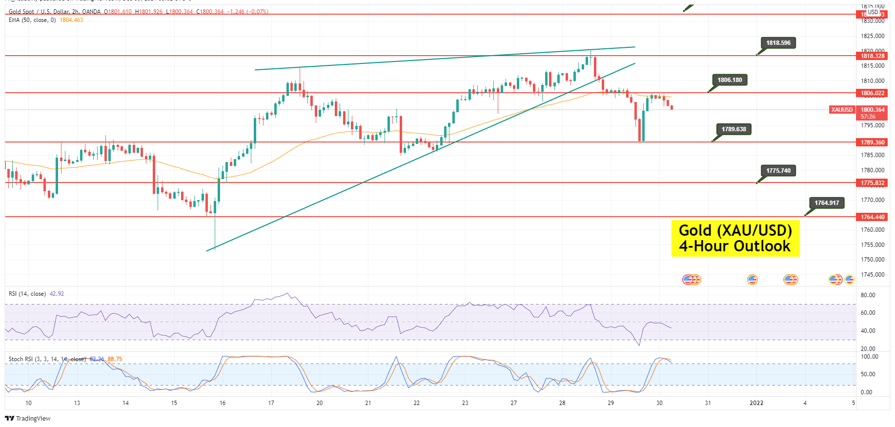 Gold is trading with a bearish bias at 1,800 level, having reversed lower after testing the strong resistance at 1,806 level. A bullish crossover above 1,806 levels exposes the metal towards 1,818. The precious metals are likely to exhibit thin trading volume and volatility amid holiday sessions. On the lower side, support stays at 1,789, and a break below 1,789 can lead XAU/USD to 1,785 and 1,779 levels. Consider looking for a sell trade below 1,806. Good luck!