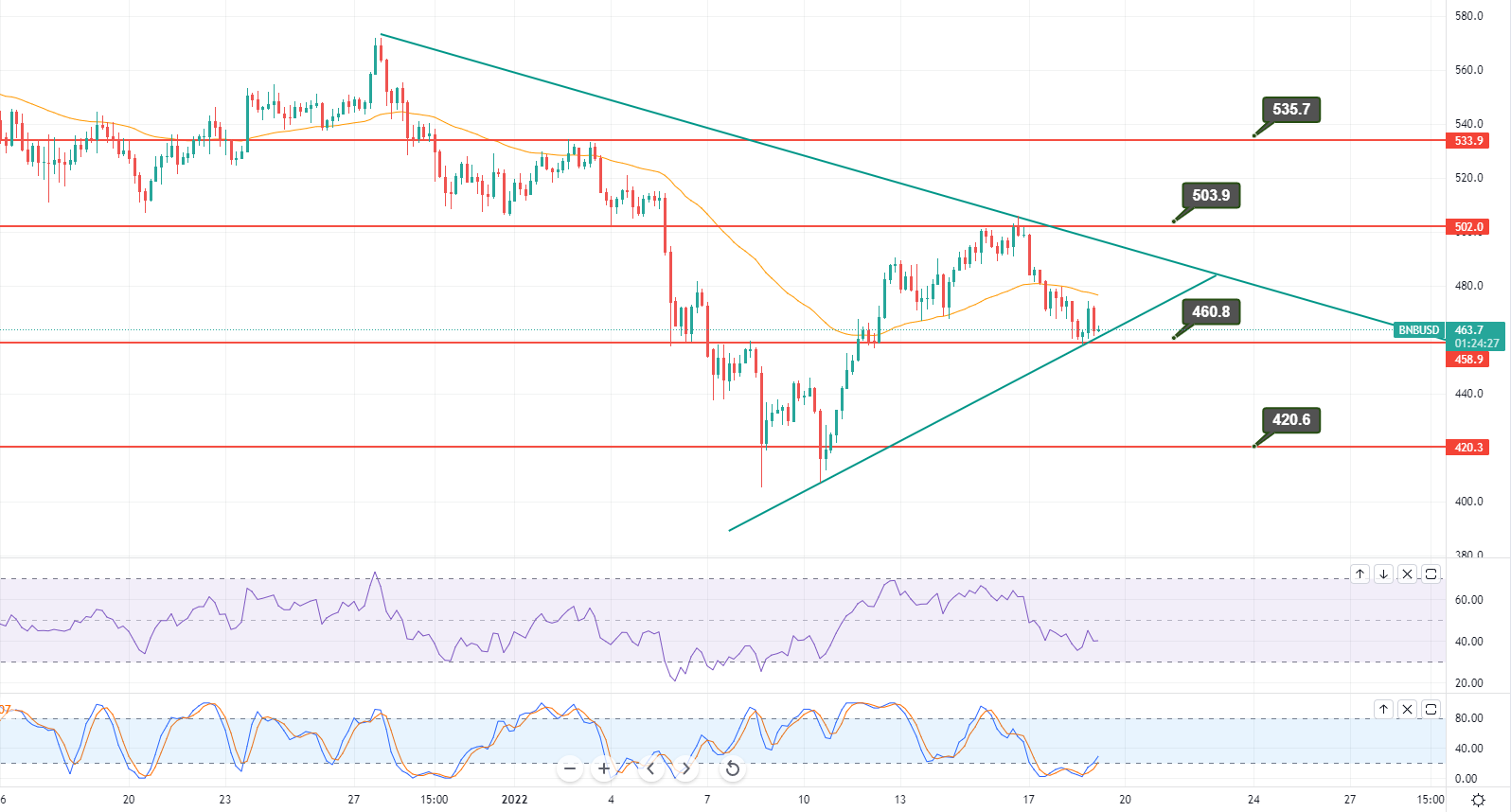 - On Wednesday, BNB/USD is trading with a slight bearish bias at 463.50, gaining immediate support at 460