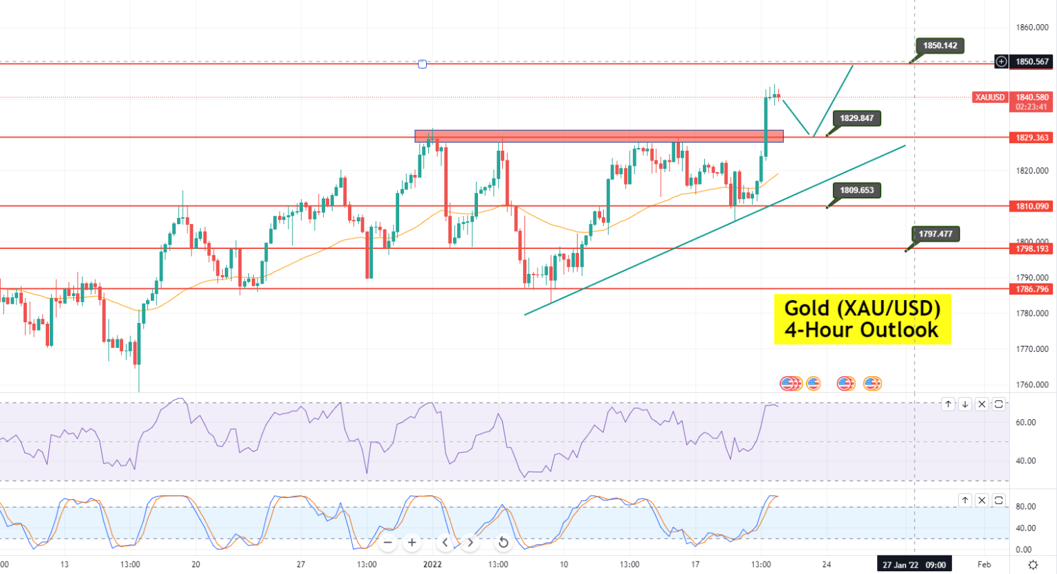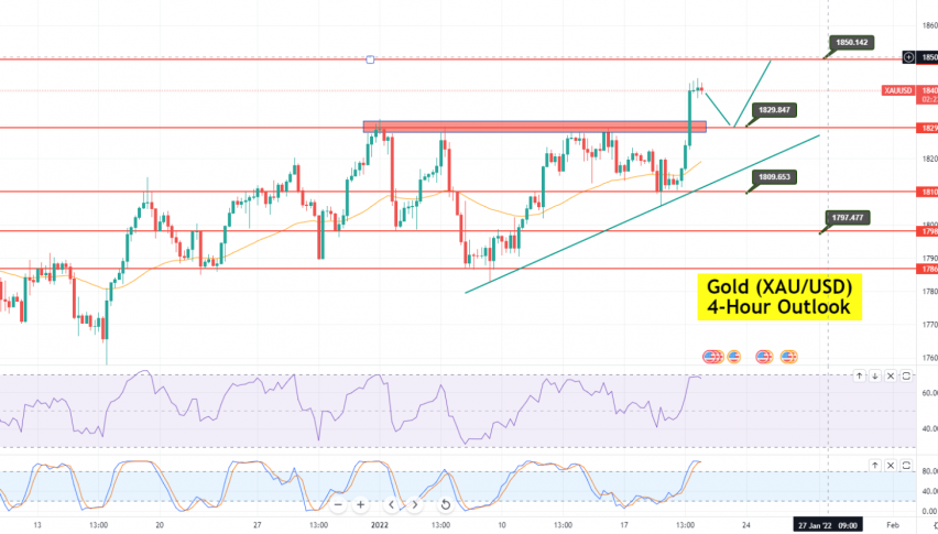 On Thursday, the precious metal, gold, is trading at the 1,840 level, with a strong bullish bias. It has violated a significant triple top resistance at 1,829 and is heading towards the next target level of 1,850. On the higher side, the XAU/USD may find the next significant resistance at the 1,865 level.