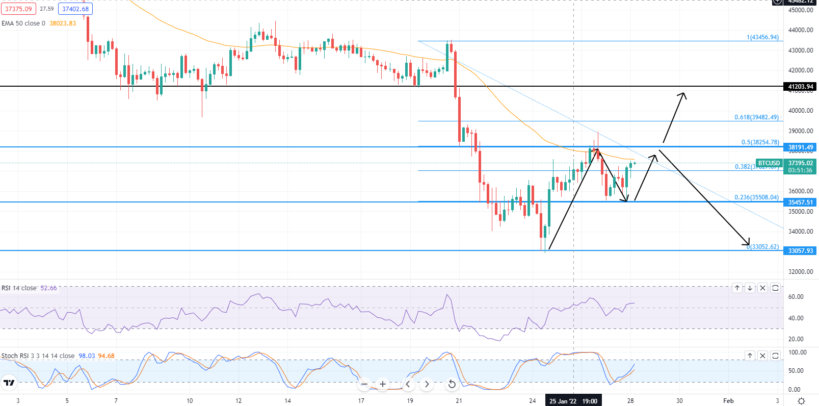 The pair is currently trading over $37,000, and the 100-hourly simple moving. It is approaching the $37,200 resistance level, and it is close to the latest 50% Fib retracement level from the high of $38,899 to the low of $35,550.