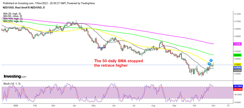 NZD/USD has been on a bearish trend for more than a year on the larger charts, although we have seen a retrace higher in recent weeks, as the USD retreated lower on expectations that the FED will slow down with rate hikes after today’s 75 bps hike. But the New Zealand dollar’s three-week rebound might have come to an end as it tests key resistance ahead of the crucial US Federal Reserve Open Market Committee meeting today.