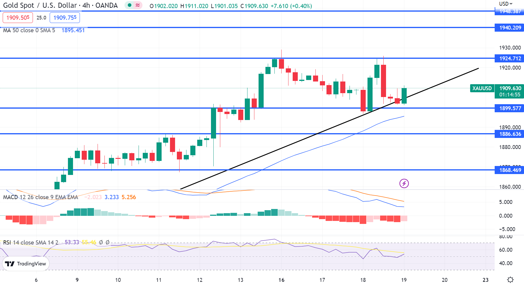 The price of GOLD is currently sitting near its weekly low of around $1,900 as it continues to decline for the fourth day in a row. The US Dollar has recovered from its multi-day low, and Fed officials are sending mixed signals with their data.