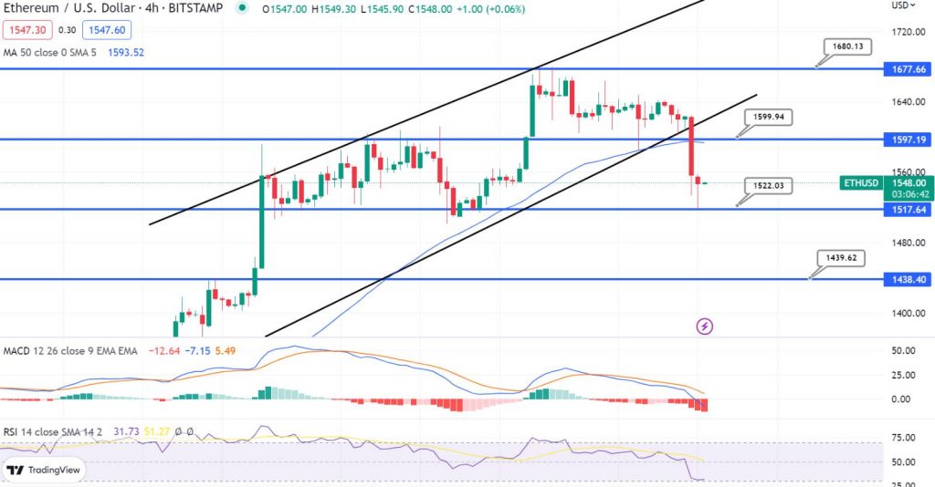 The price fell more than 6% in a single day, trading well below the $1,550 support level. The price has produced a bottom near $1,518 and is now consolidating losses.
