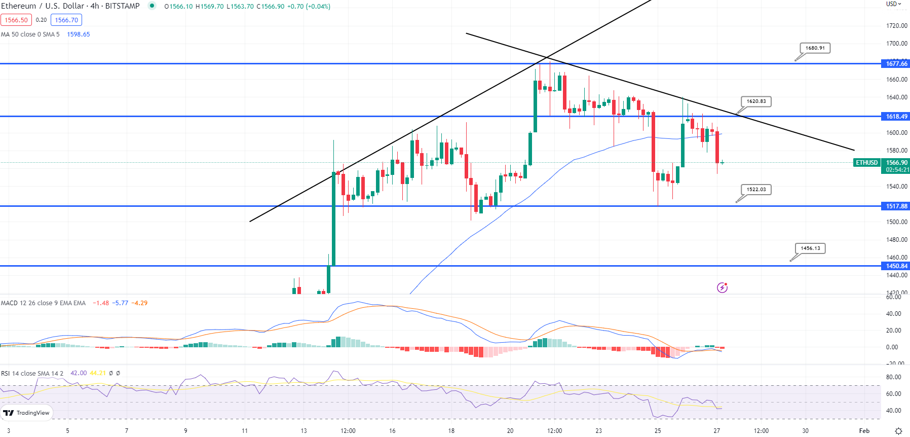 Ethereum’s price may continue to fall if it is unable to break down the $1,600 barrier level. The bottom trend line of the triangle, or around $1,550, provides initial support below.
