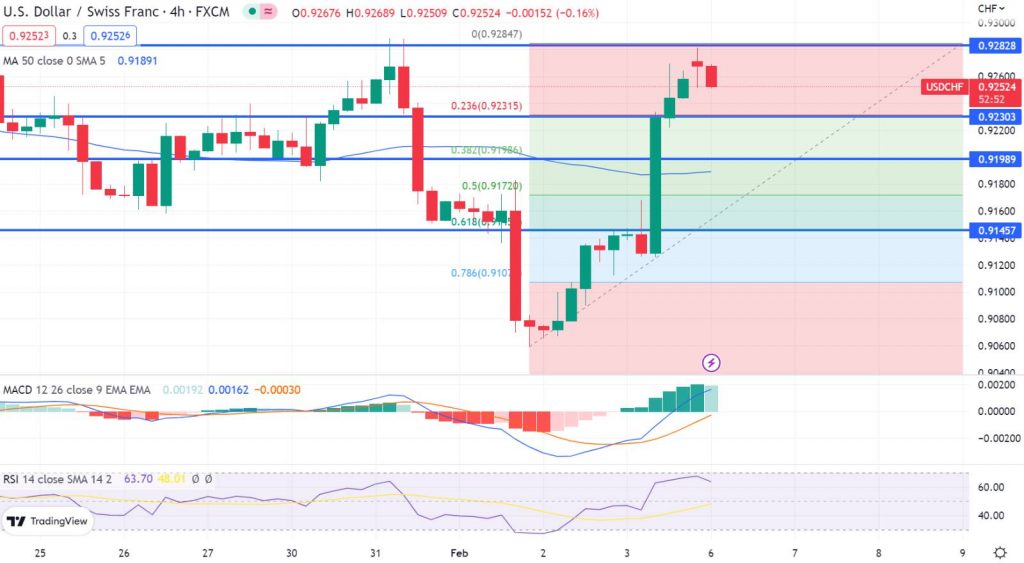 The USD/CHF currency pair is seeing a significant increase during the North American trading session on Friday as Wall Street is expected to close the week with losses. At present, the USD/CHF is trading at 0.9260, which is a jump of 1.42% compared to its opening price.