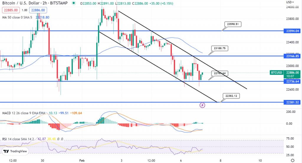 BTC has been on a downward trend and has even dropped below the $22,800 threshold. It approached support level of $22,600 but was unable to sustain that level for longer than a few hours.