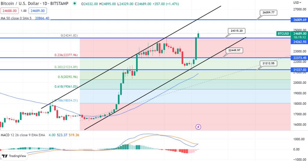 The price of BITCOIN has risen significantly, increasing by over 10% and surpassing the $24,000 resistance level. The cryptocurrency traded near $25,000 and is expected to continue its upward trajectory in the near future. There is a prevailing sentiment that the current support will enable the coin to experience further gains.