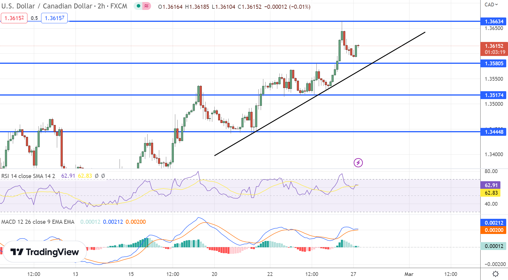 Additionally, the downside break of the two-week-old previous resistance line played a role in the pullback moves. However, the bullish MACD signals and the upward-sloping support line from February 14, around 1.3570, challenge the USD/CAD bears. If the Loonie pair’s bears break the stated support, the 61.8% Fibonacci retracement level around 1.3535 could be the next target. Nevertheless, the swing high in late January, around 1.3520, and multiple tops marked in late January and early February near 1.3480–70 could hinder the USD/CAD sellers.