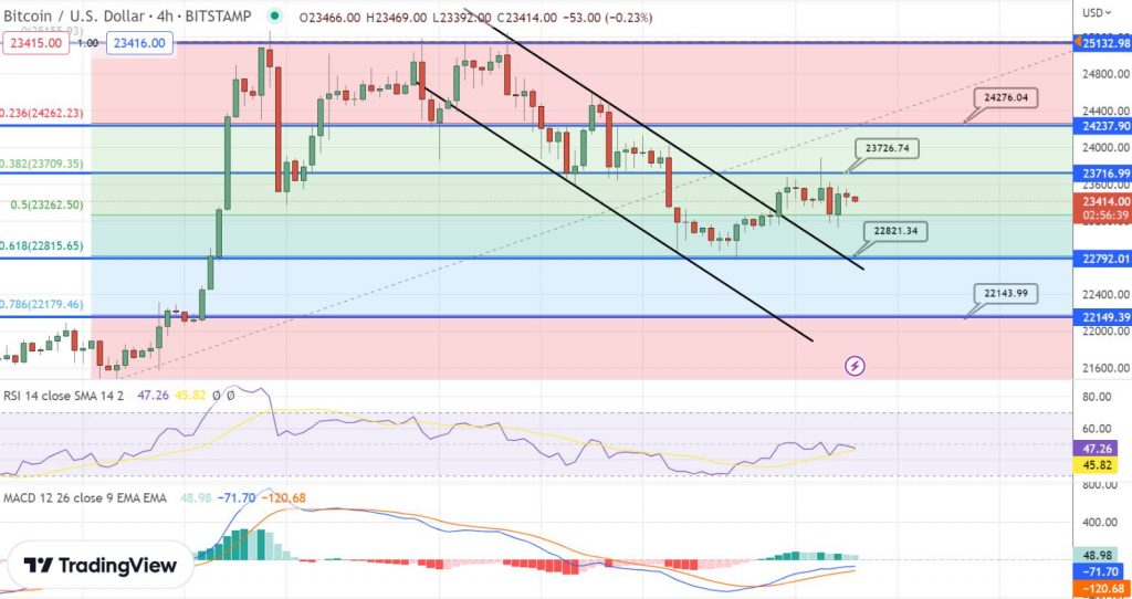 However, if Bitcoin fails to break above the $23,650 resistance level, the price may continue to fall, with near-term support at $23,200 and the next significant support level at $22,800. If the downward trend continues, the price could drop to $22,200, with the next key support level at $22,000.