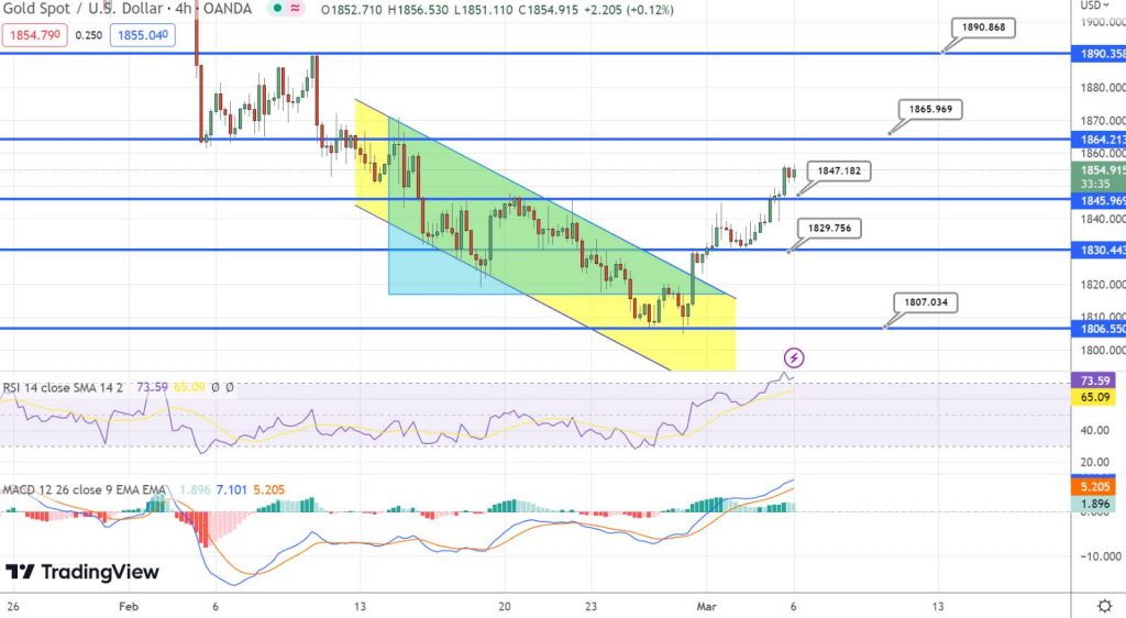 At the start of the week, the price of GOLD has decreased as investors await the rate forecast from Federal Reserve Chairman Jerome Powell. The upcoming data from the US labor market by the end of the week is also expected to be crucial. As of now, GOLD has lost 0.15% with a drop from a high of $1,855.43 to a low of $1,851.47.